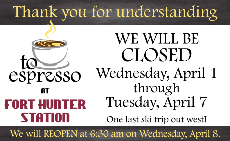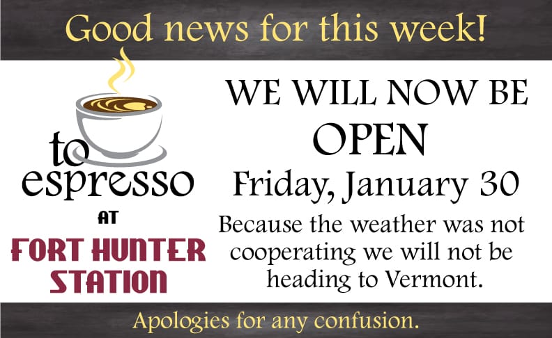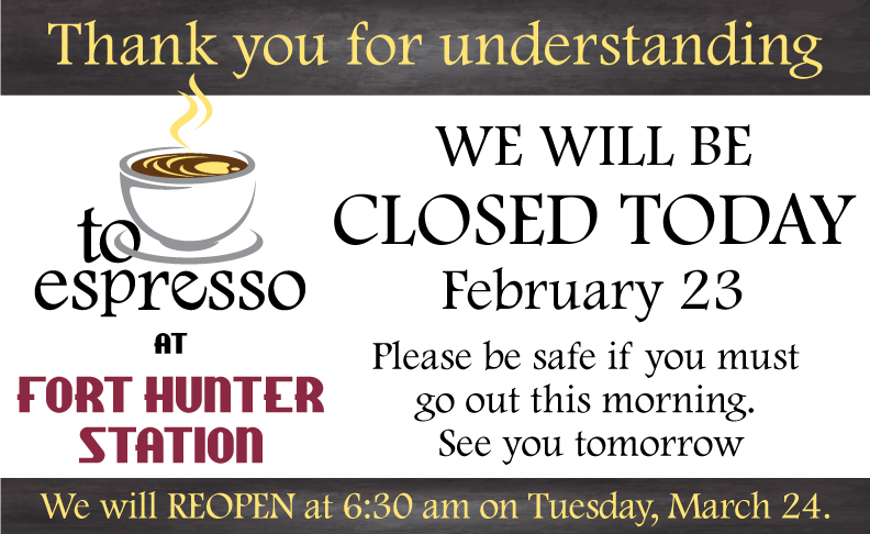 Look for the “TO Espresso at Fort Hunter Station” sign on your daily morning commute! We ask for your patience as daily operations may be affected by construction at the Station building throughout the year. Come grow with us!